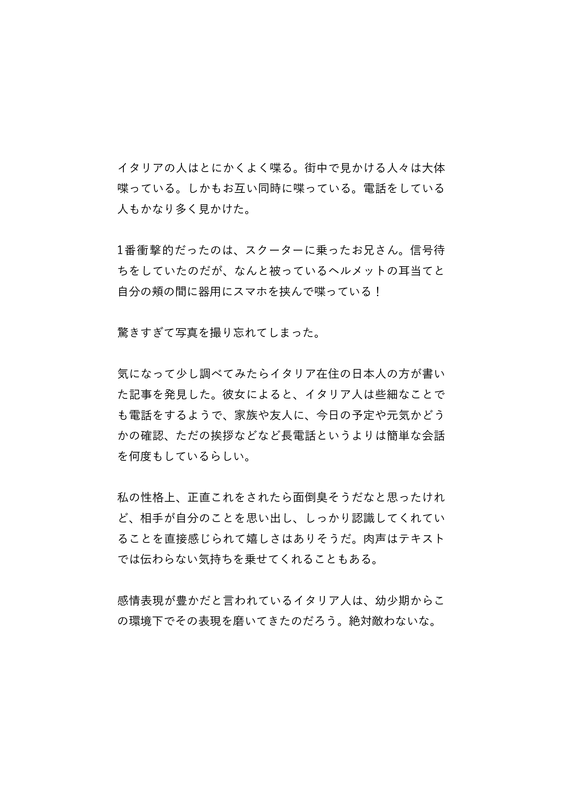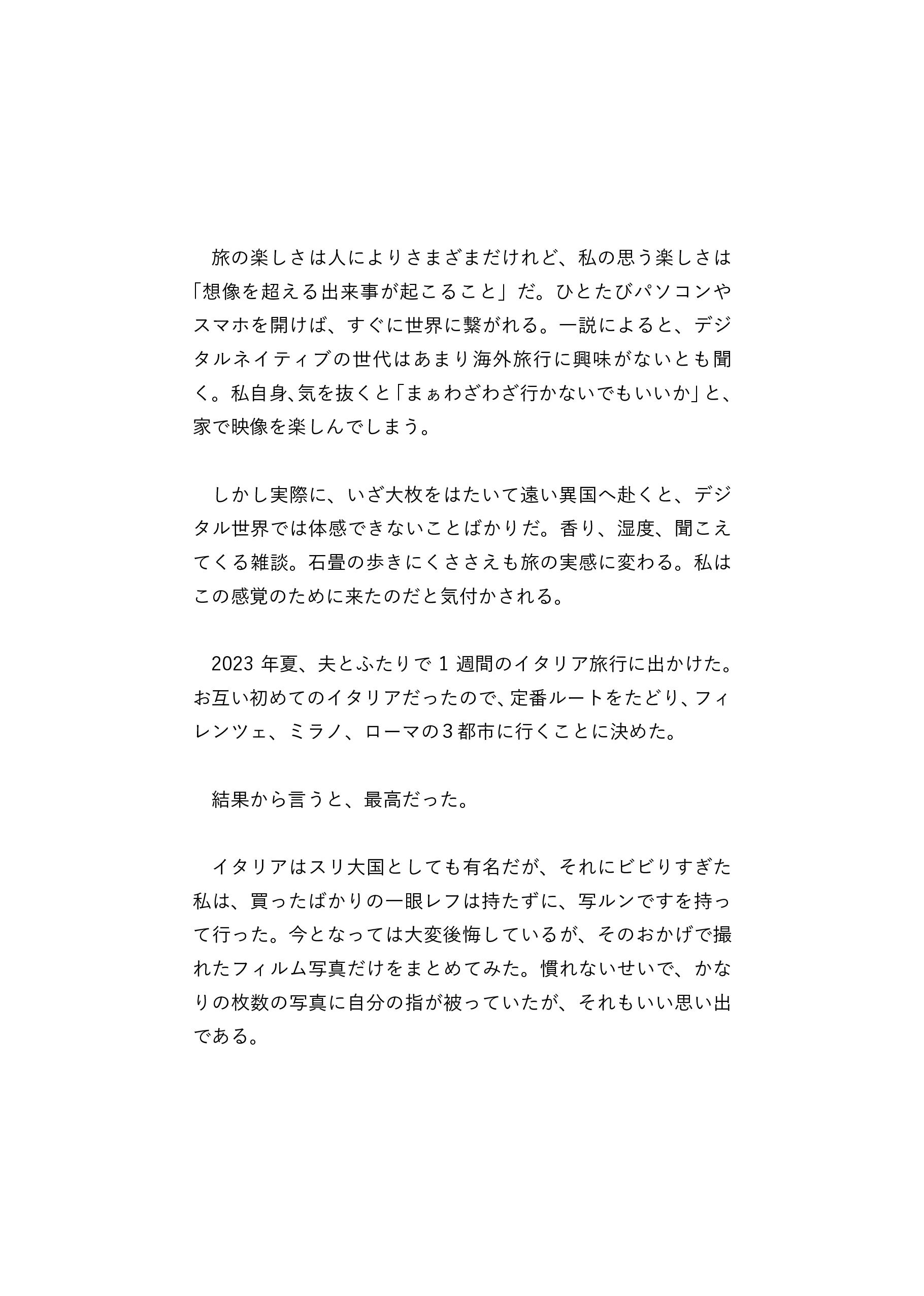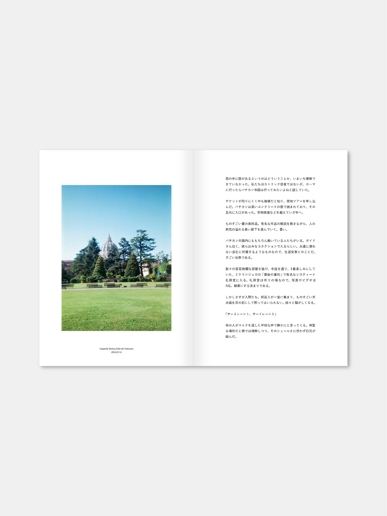 2024年7月に行ったイタリア旅行での出来事を写真と文章でまとめたZINE。写真はすべて「写ルンです」で撮影したフィルム写真を、加工なしの現像そのままで掲載しています。写真に合わせて、7泊8日の旅行中の出来事や感じた文章を添えています。真夏の強い日差しを感じるフィルム写真と、平凡な、でもなぜか起こる少しの珍事件が混ざり、イタリアに行ったことがある人は昔の旅を思い出し、まだ行ったことのない人は、まだ見ぬ街を想像するような一冊です。
